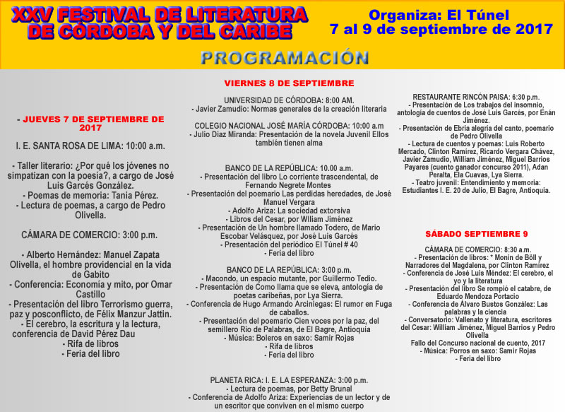 – Lectura de cuentos y poemas: Luis Roberto Mercado, Clinton Ramírez, Ricardo Vergara Chávez, Javier Zamudio, William Jiménez, Miguel Barrios Payares (cuento ganador concurso 2011), Adan Peralta, Ela Cuavas, Lya Sierra.